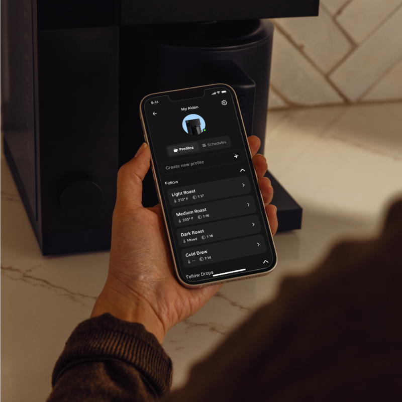 Med indbyggede pre-sets til lys, medium og mørkristet kaffe er Aiden utrolig nem at bruge – også for begyndere. Vil du have mere kontrol, kan du tilpasse alle parametre selv via maskinen eller Fellow-appen. Du kan endda downloade bryggeprofiler fra dine yndlingskafferisterier og brygge kaffen præcis, som den er tiltænkt.